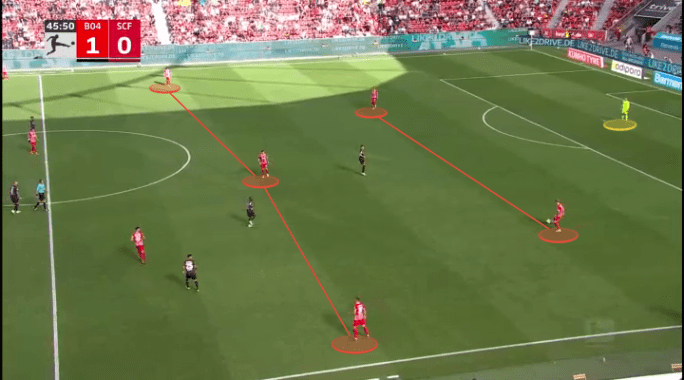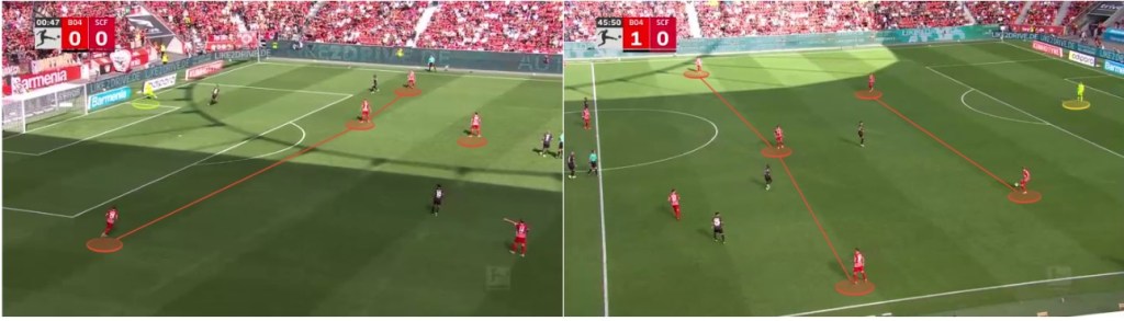 Leverkusen looked the stronger side from there, nicely floating between that 5-2-3 and 5-3-2 across the defensive phases of the game. Christian Streich knew he had to make a change in the second-half, and used an injury to Manuel Gulde as the perfect opportunity to switch to a back-four. They went from their alternative back-three shape to their favoured 4-2-3-1, that has led to much success this season.