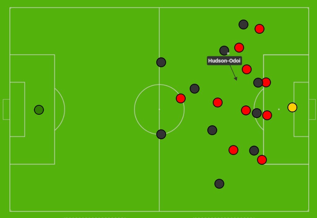 Embed from Getty ImagesBut back to the match, this fresh second-half-start from Freiburg then prompted Leverkusen to make a tactical switch of their own, as they re-adopted their favoured 4-2-3-1 themselves. They threw on a natural left-winger – the terrorizing Callum Hudson-Odoi, and moved Diaby wider to the right, where he could better connect with Jeremie Frimpong on wide overlaps and overloads. But it was down the left where the impact was immediately felt, as Hudson-Odoi’s pace and trickery immediately caused Freiburg a headache. His right-footed dominance and desire to cut inside allowed Sinkgraven to gallop on the overlap, and consistently forced his defender into a difficult situation to contend with.
