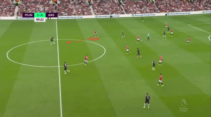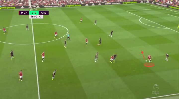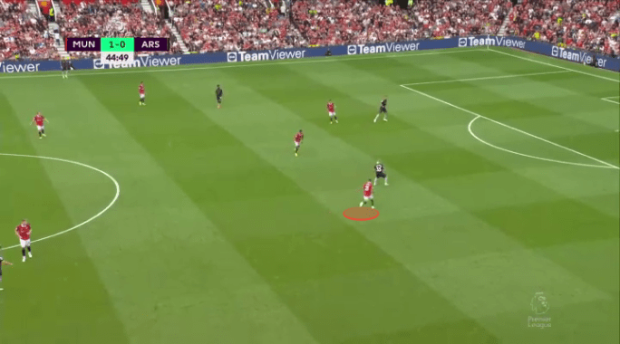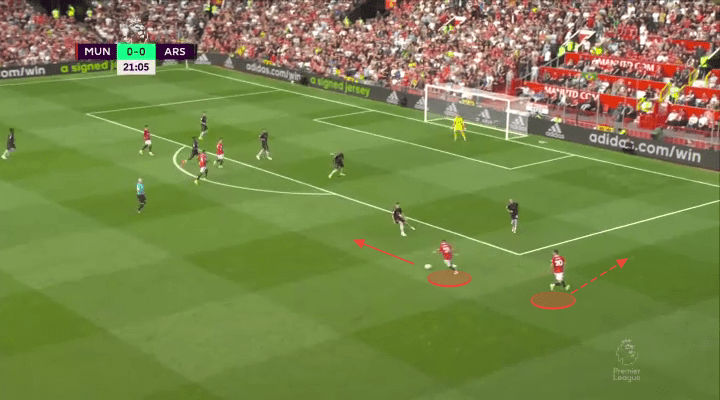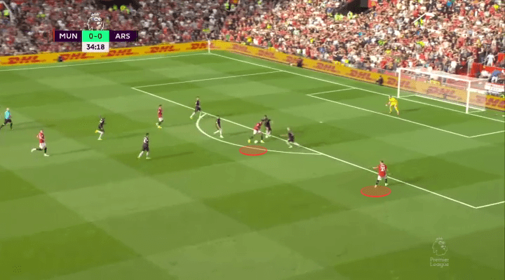 It nearly did on the Eriksen chance we highlighted already, and continued to have the potential to confuse and kerfuffle Arsenal’s defense all game long. If Dalot can take more opportunities like this to overlap and underlap his winger, opposition defenses will have much to contend with down United’s right this season. Not only does this sort of forward thrust create the potential for 2v1’s, but it also means the opposition are less likely to leave dangerous attackers forward in cases of transition. Above and below you can see two instances where Martinelli felt the need to come all the way back to combat his Brazilian friend.