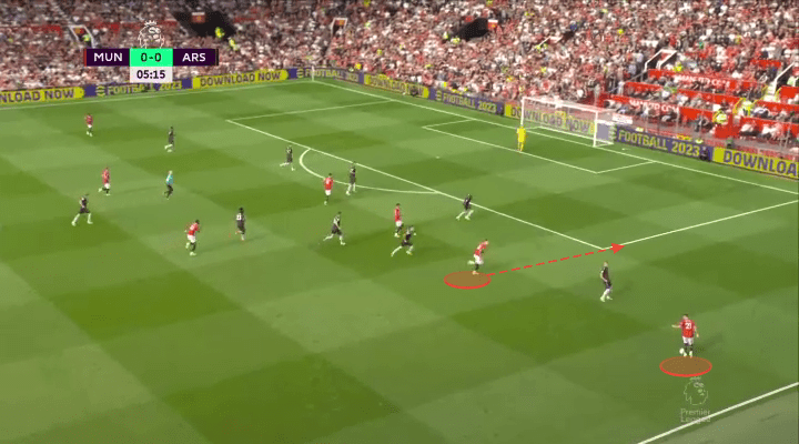 The potential for an overload like this simultaneously allows more room in the centre for someone like Scott McTominay to receive from a deeper position, and drive forward or switch play to the other side. It’s the overload and isolate tactic that Erik Ten Hag prioritized throughout his time at Ajax, and United will only grow in this approach as they become accustomed to one another’s services.