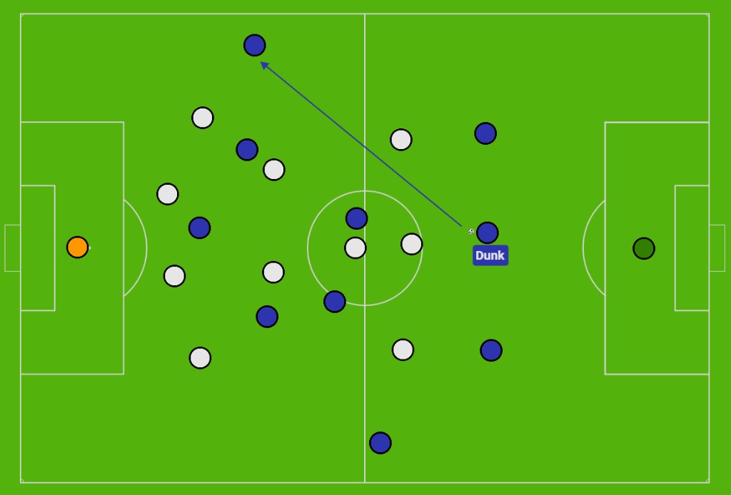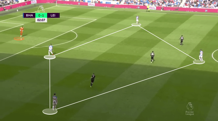 Those passes are primarily channeled toward the half-spaces for an ‘Inverted Winger’ or striker to chase. Trossard and Welbeck both love to channel run, almost as though they’re competing against one another for a channel running prize. But the team’s long passing exploits can also be used as mechanisms for switching play from side to side, with the Seagulls always maintaining width in the form of their wing-backs.