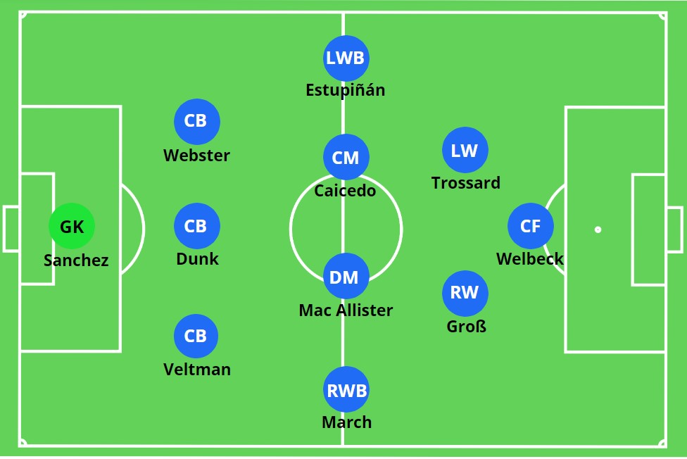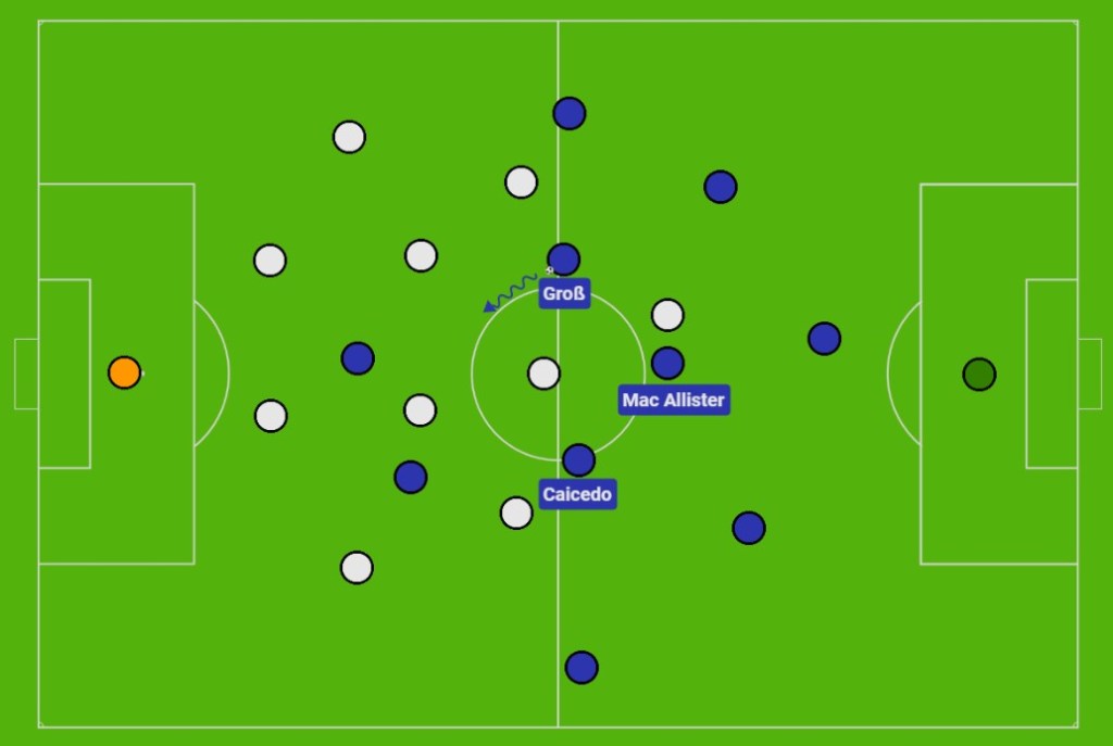 Embed from Getty ImagesThe move of Mac Allister to defensive midfield has been crucial to that formational change, as it’s freed up Pascal Groß to play in an advanced role. He’s been more an ‘Inverted Winger’ this time around, even though he plays the role very much like an advanced ‘8’. This notion is elucidated all the more when Enock Mwepu plays as the other ’10’ in the team, as he favours central areas and plays the part more like a ‘second striker’ in behind Danny Welbeck.