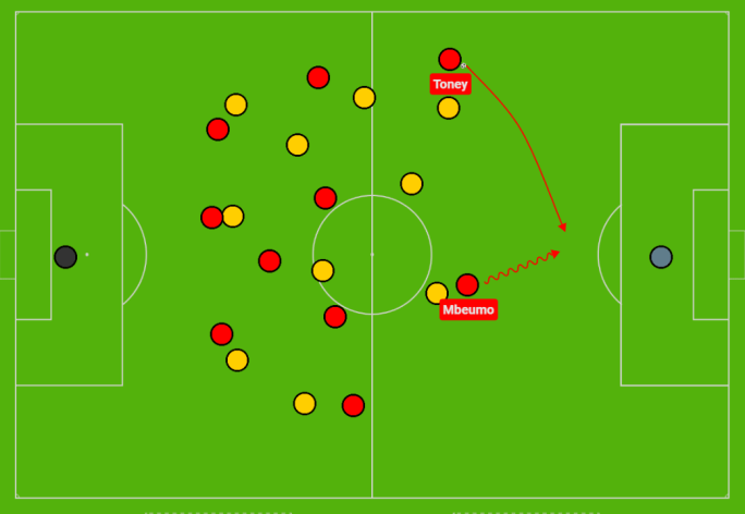 Embed from Getty ImagesUp front, Thomas Frank has a clear and consistent pairing that he loves to deploy, and Ivan Toney and Bryan Mbeumo have thrived alongside one another this campaign. Both can be used as initial outlets in transitional moments to quickly advance up the pitch, with Toney more of a ‘Target Man’ and Mbeumo a speed demon who loves to race in behind.