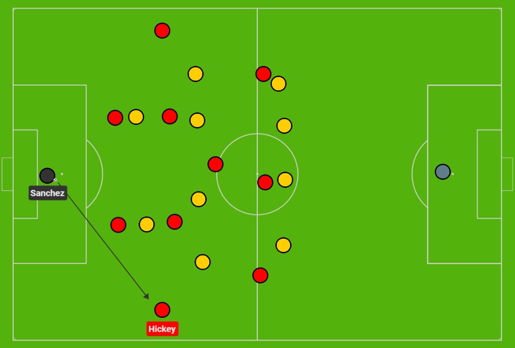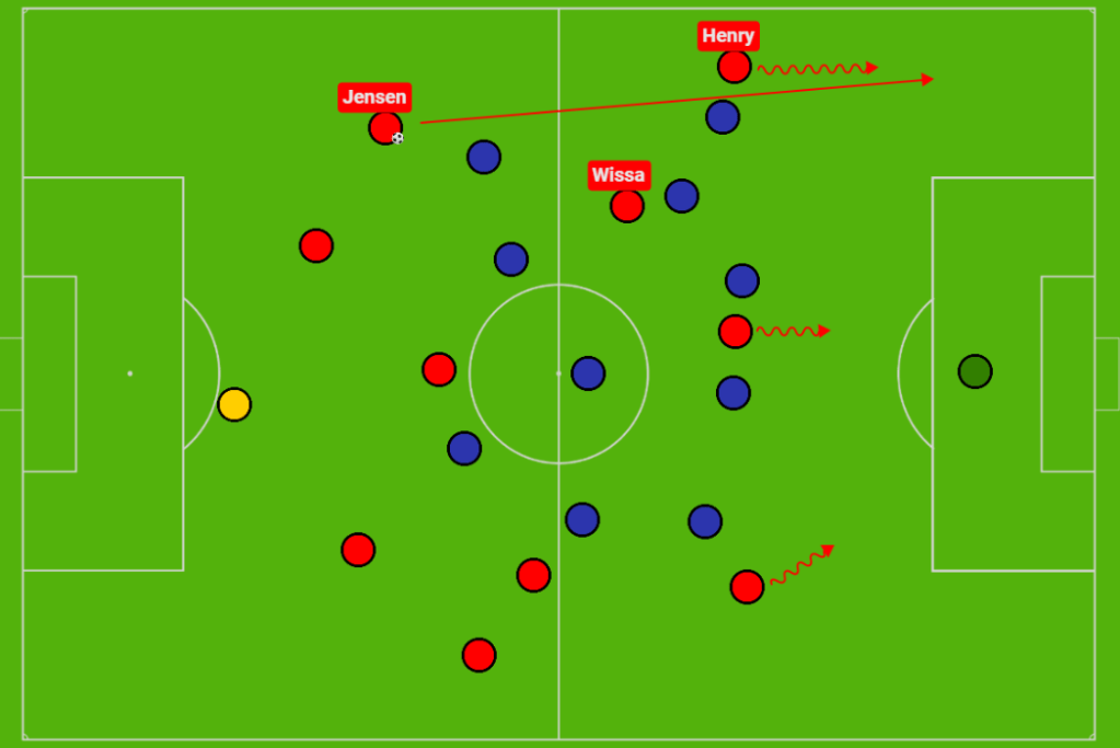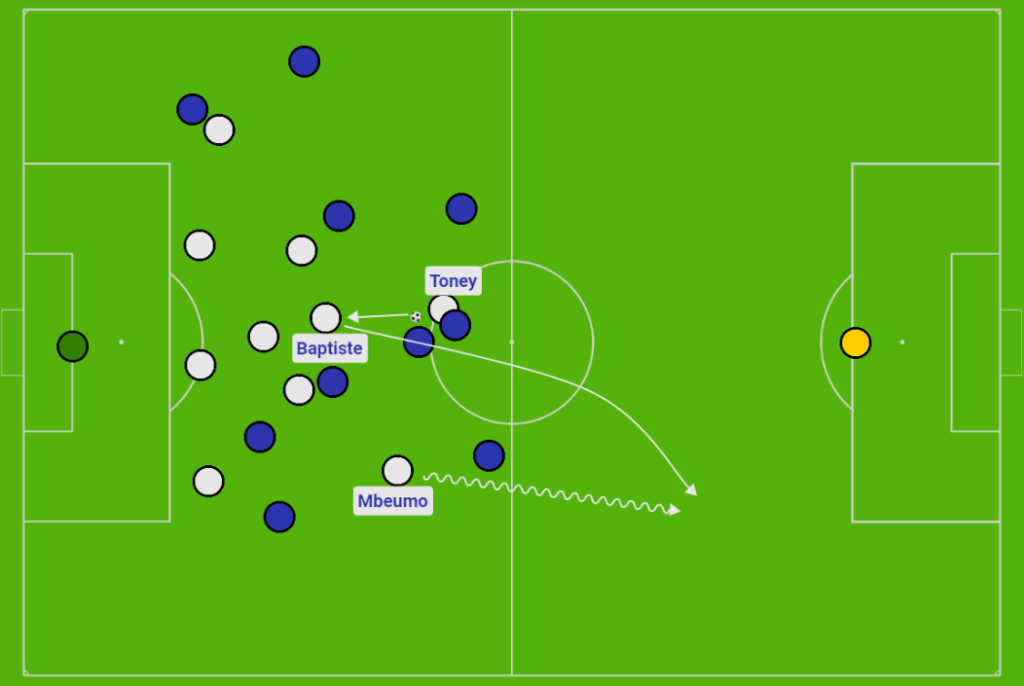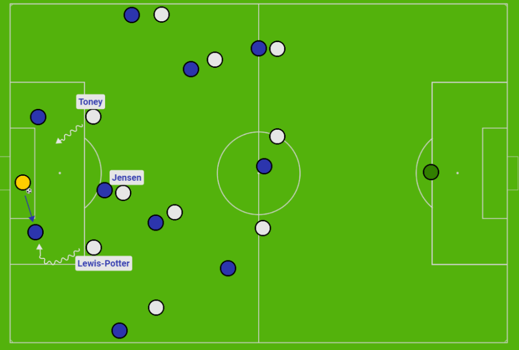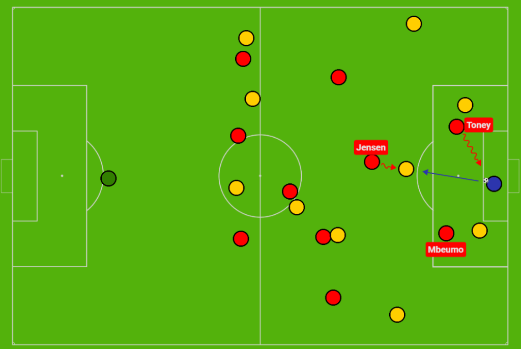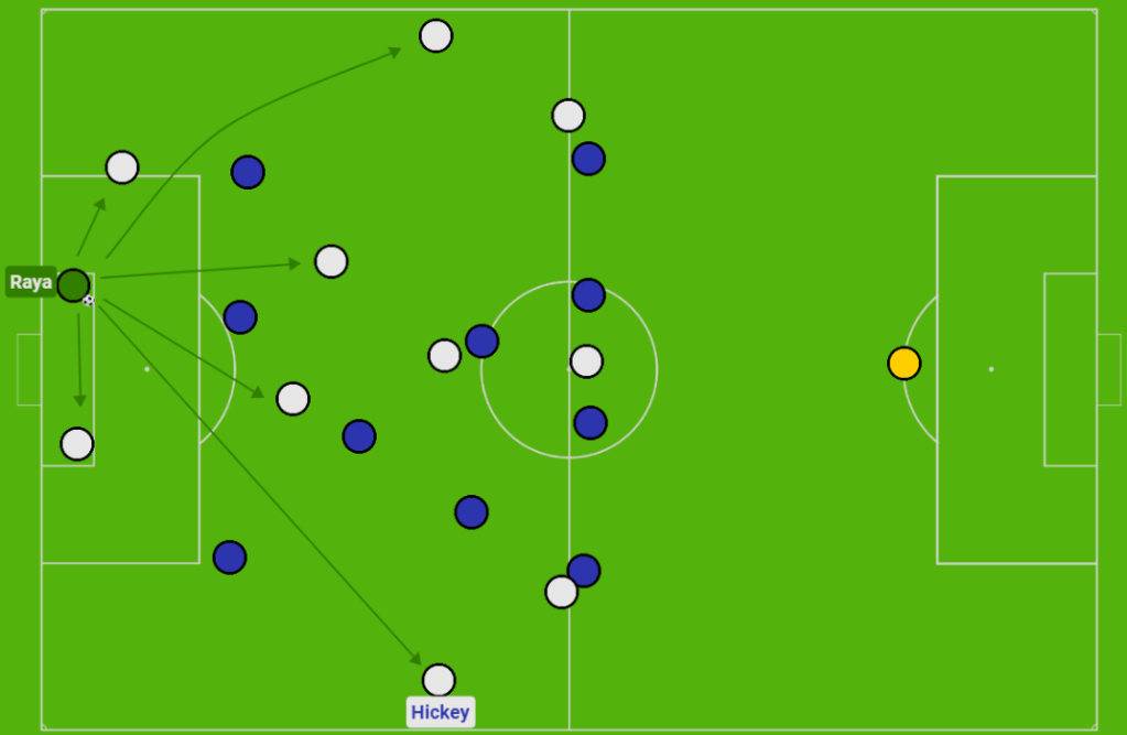 With two midfielders coming inside to support build-up play, the opposition are attracted to central positions, allowing Hickey and Henry more space to advance up the pitch. The narrow positioning of the front three further supports this process, ensuring a winger and wing-back never get in each other’s way. From Raya’s point of view, sometimes he can play short to his centre-backs, and other times he goes long to Toney, knowing the aerial strength his centre-forward possesses in the air. But the most effective pass can frequently be found directly into the wide channels for Hickey or Henry, where the opposition are unable to shift across quickly enough.