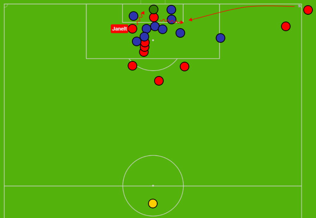 As soon as the Bees win back the ball, the front three immediately swarm away in search of all the honey, readying themselves to receive long passes and stretch the opposition. With immediate counter-attacks, usually it’s the front three linking up to create a 1v1 with the keeper, but when Frank’s side have to break down a more compact defence, Henry’s crossing qualities come into play. Brentford sit fifth for crosses this season (13.3, according to FBRef), and a fair amount of their goals have been scored from crossing or set-piece situations this season (33%).