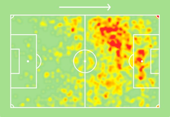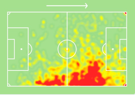 Here’s another example from RB Leipzig’s Christopher Nkunku. While the Frenchman is a fabulous player that can play either on the right or left, we would still expect his heatmap to spike higher in the half-spaces.