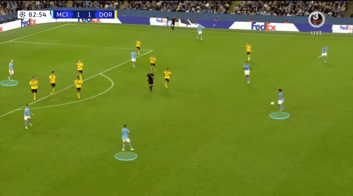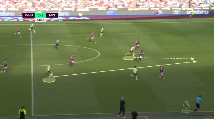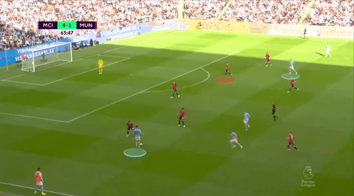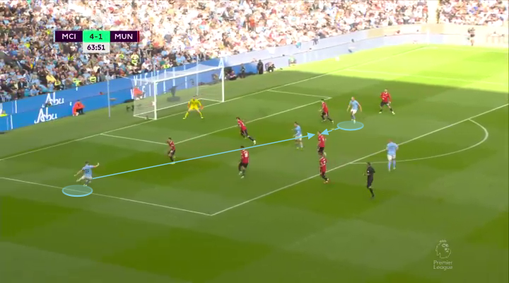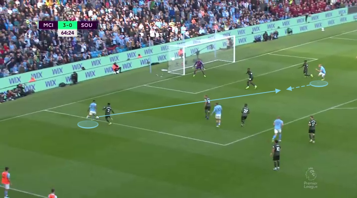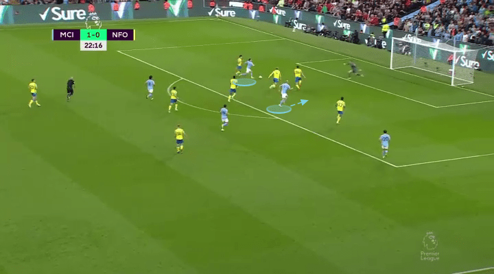 When the ball finds itself out wide with someone like Cancelo or Foden, Haaland knows to hold his run, and seek a pass that finds him in front of the opposition defense.
