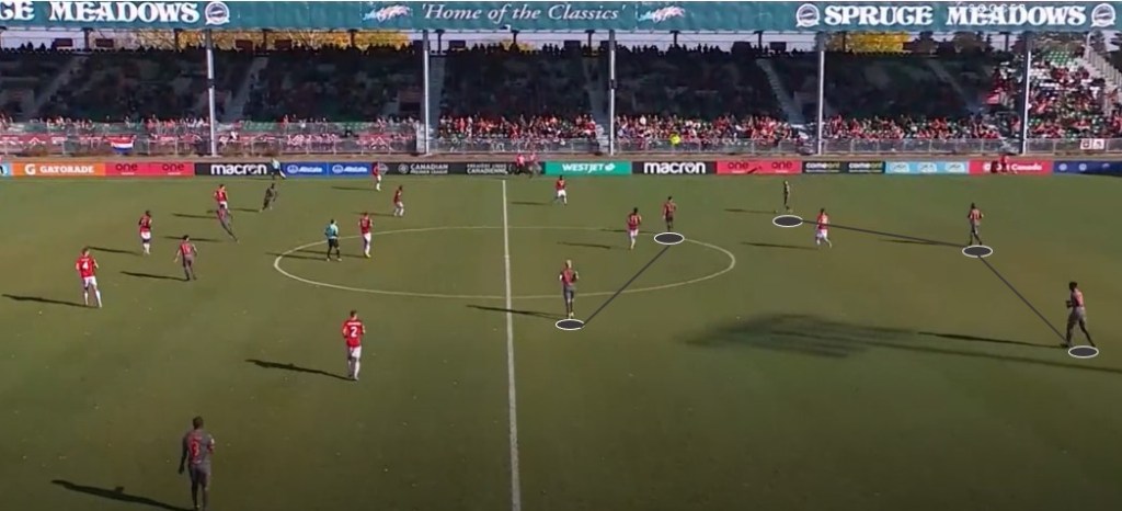 Cavalry set up in their favoured 4-2-3-1 shape, using Roberto Alarcon as an up-and-down winger in front of Daan Klomp. Jose Escalante meanwhile featured as an up-and-down left-back, nicely adapting his position to accommodate the movement of Mikaël Cantave. As Cantave drifted inside, Escalante found room up the left wing to cross. But he could also invert himself, allowing the Haitian forward to remain wide instead. Rama and Choinière had a difficult time contending with these wide rotations, but the right-side is where Cavalry had even more success.