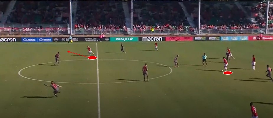 On the other hand, Hojabrpour’s scanning of the field was excellent as he dropped into various spaces to pick up the ball and play forward, and he had an enjoyable evening in dribbling forward and playing long passes into space. He nicely covered the width of the field to combine with David Choinière in particular, playing a beautiful through pass into his right winger for one of the best chances on the night.