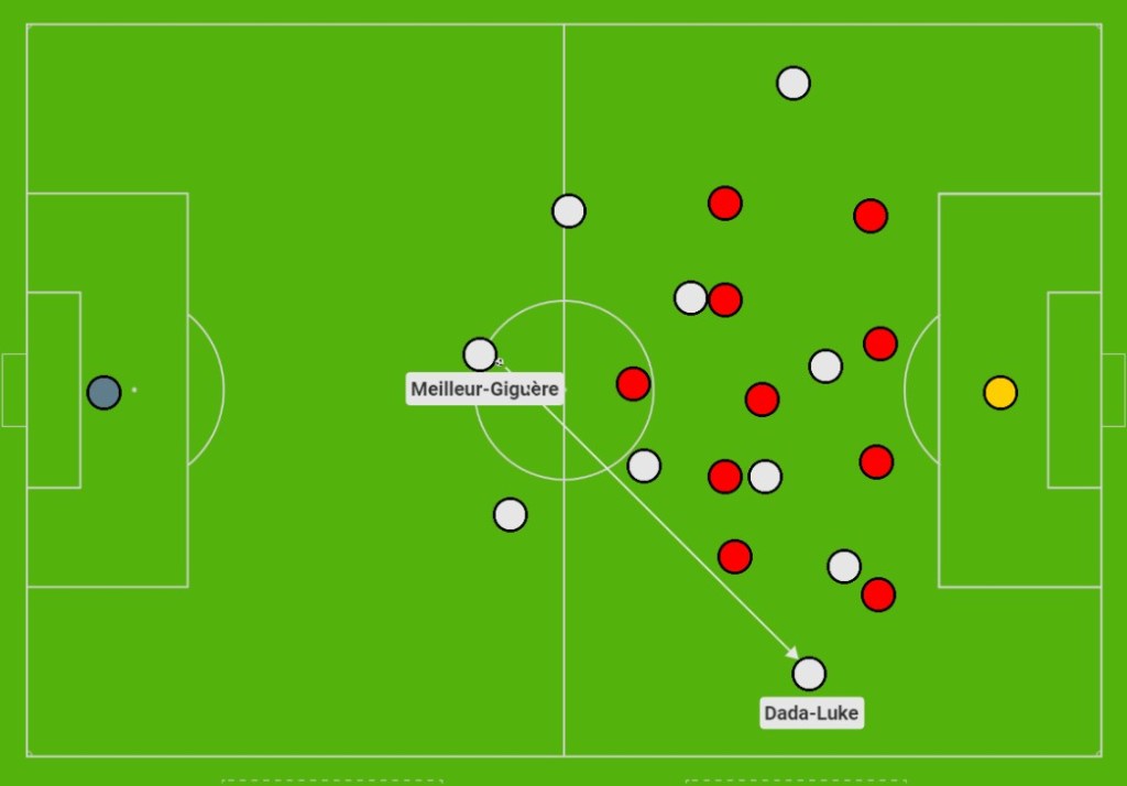 Starting with Pacific, James Merriman set his team up in a 4-1-4-1 formation, with Manny Aparicio floating in and out of the ’10’ position as he drifted toward the ball. Often as he dropped to receive, Sean Young would float higher, and Marco Bustos would come inside as Olakunle Dada-Luke stretched the width. Cedric Toussaint and Nathan Mavila would usually be the ones to hang low instead, as Thomas Meilleur-Giguère operated as the deepest member of the build-up to switch play and give himself extra yards in transition. Didic operated angled and higher than TMG, whilst Mavila’s often inverted position meant that Heard could operate high and wide down the left, where he was largely uninvolved. Kamron Habibullah existed as something of a ‘False 9’, drifting away from the compact Atletico defense to receive in central spaces.