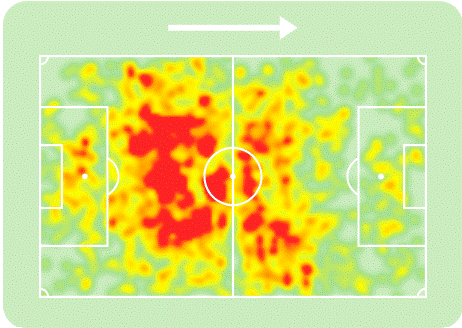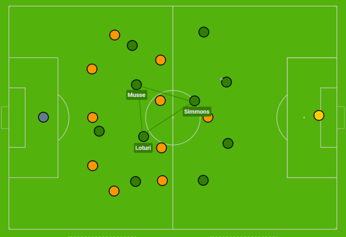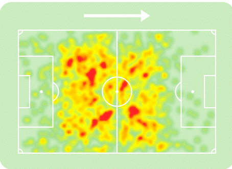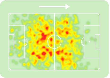 Even despite being defensive midfielders, you can see just how much ground the likes of Hojabrpour, Gutiérrez and Rampersad covered this season. As a left-footed player playing on the left-side of a double pivot, Gutiérrez spikes highest on his natural side. Hojabrpour meanwhile showcases a tendency to drift over to the right-half-spaces and combine with Sissoko and Rama, but that is also where the midfielder would play when not in the role of the ‘6’. Simmons and Toussaint have covered the least amount of ground this season, which is partially down to accumulating fewer minutes for their teams.