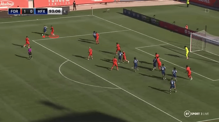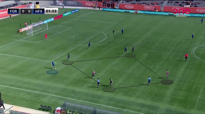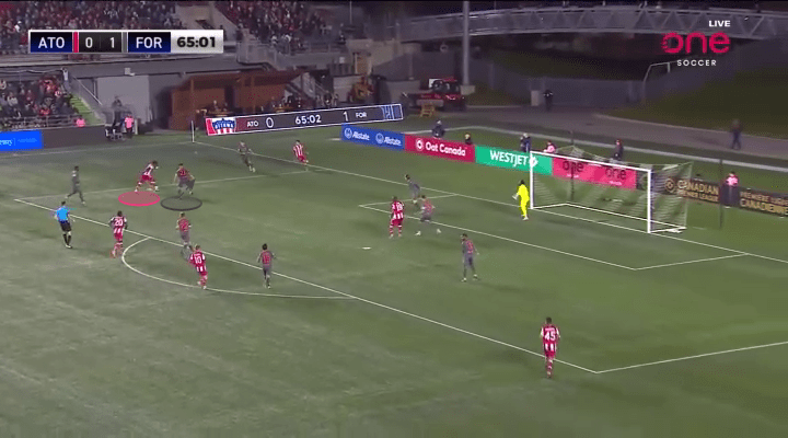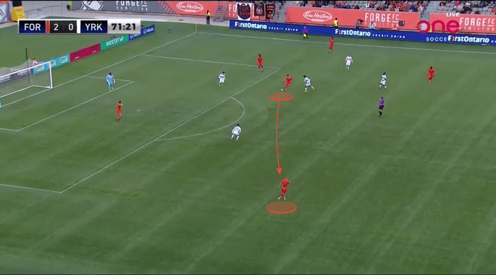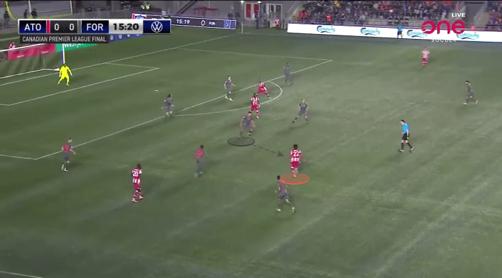 Forge often built out from the back in a 3+1 to 3+2 shape, involving Hojabrpour and his deep-lying partner in crime – Kyle Bekker. Although he could find himself bypassed in the process as the likes of Rama and Alexander Achinioti-Jönsson dominated the ball, Hojabrpour would often be afforded time and space to get on the ball with his head up, and seek those progressive passes up the field. Teams like Atletico Ottawa would sit back and allow the 22-year-old time and space on the ball, knowing that they’d have a better chance of contending the long-pass if they sat deep and allowed limited room to receive in advanced areas. But this only allowed a player like Hojabrpour to grow into the game and advance into the attack on his own, where he was able to inject variety into the team’s attacking play closer to goal. It also allowed the 22-year-old to drop into the back-line or shift wide of the two centre-backs to receive, again injecting variety into the team’s play in pushing others further forward.