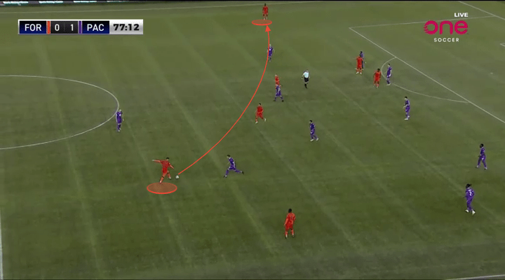 Hojabrpour magnificently fulfills his defensive responsibilities for Forge, performing the exact role you’d want of a defensive midfielder in a high-tempo team. This is the act of helping to immediately break up play in transition, where Hojabrpour excels in reading the play and shifting out of his normal position to aid the cause. As others race back into position, the 22-year-old is able to hold his own, angle his opponents toward the touchline, and help his team win back possession.