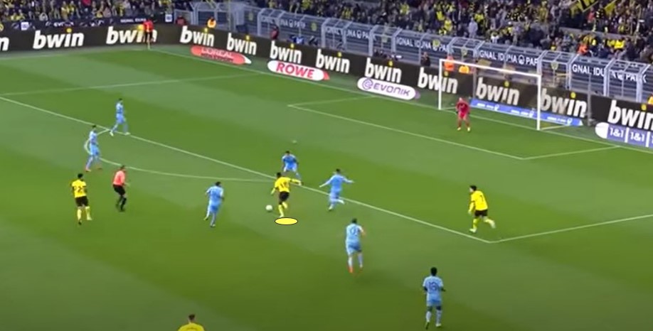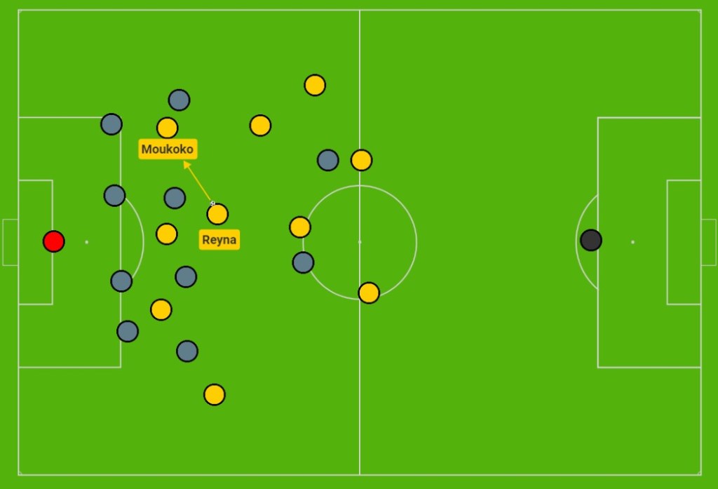 What’s been perhaps most impressive about Moukoko’s efforts so far this season has been his growing tactical understanding of the game. As Reyna shifted inside, Moukoko drifted out wide to receive away from congested areas.