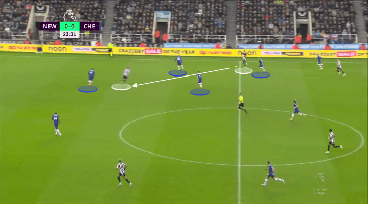 As seen against a team like Chelsea who operate in a back-three, this powerful running becomes a constant nightmare as the Paraguayan seeks space in between the gaps of centre-back and wing-back. As a player like Kalidou Koulibaly charges out to challenge him and create a 2v1, you already know the next line. More space becomes available for others to advance unnoticed. This is what the best dribblers in the world – the likes of Mohamed Salah and Neymar – do so incredibly well. While Almirón is clearly not at the same level and hasn’t even won over 50% of his dribbles this season, his constant buzzing like a bee serves as a constant nuisance for even the top-level of Premier League defenders to contend with. He never shies away from taking on several players at once, in fact backing himself in any 1v1 duel before playing the pass at the right moment.