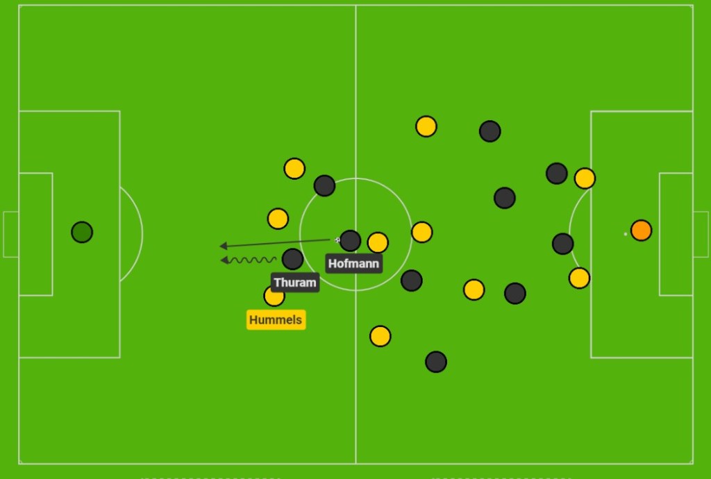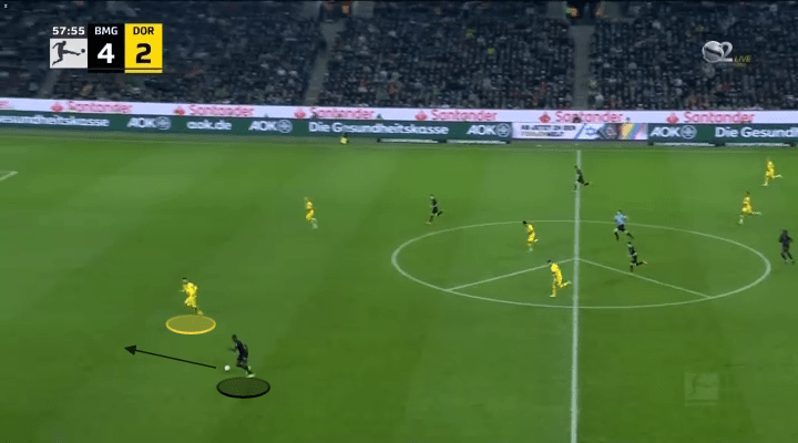 So many ex-Dortmund players came back to haunt the Black & Yellows on the day, but none more than Hofmann, who flourished as a ‘Creative Ten’ in the second half. His ability to link play through the thirds and quickly join Thuram in transition caused Dortmund’s back-line a nightmare of a time, and he popped up with two assists on the night. But the true key to success was in Thuram’s ability to time his runs from out-to-in or in-to-out, perfectly matching the timing of the pass in behind.