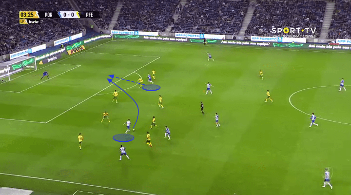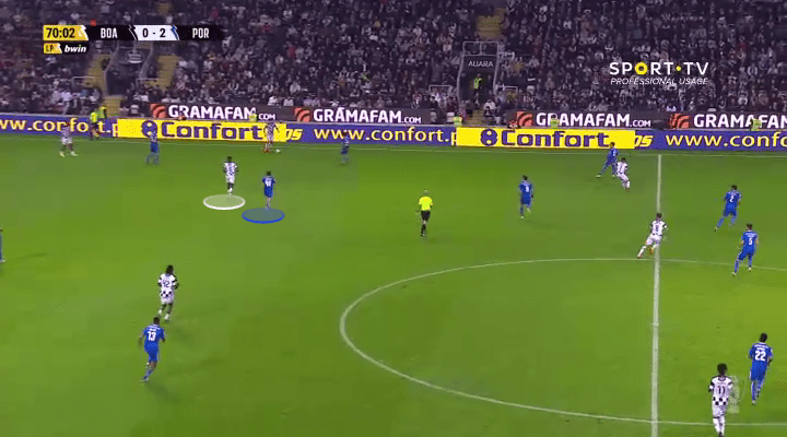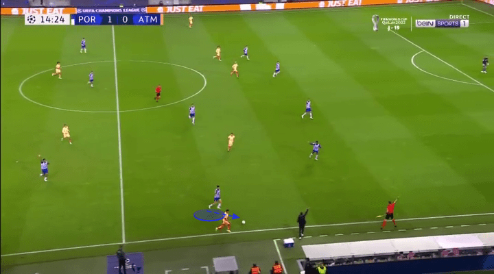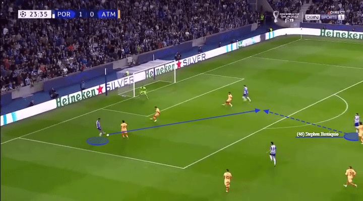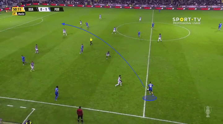 For FC Porto, the 25-year-old is also excellent in covering the wide areas in behind an opposition winger. Porto’s defensive structures will typically adapt to more of a 4-2-3-1 or 4-2-2-2 mid-block, which means that space can be sought in between that gap between wing and full-back.