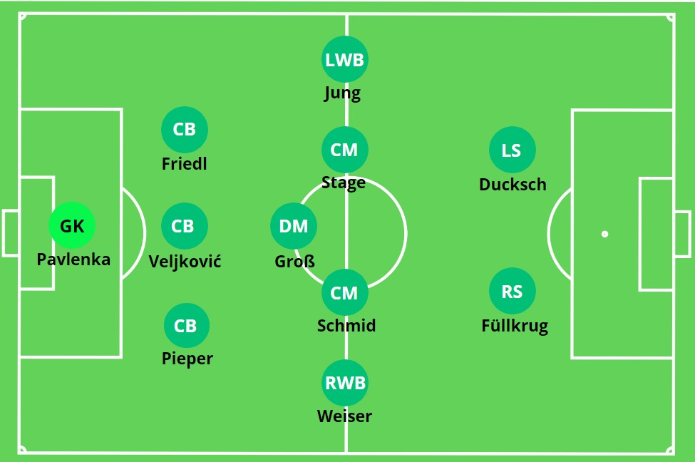Ole Werner has firmly settled on a 3-1-4-2 formation this season with Die Grün-Weißen, carrying on from the team’s brief stint in the 2. Bundesliga. Within the shape, five of Bremen’s new signings have made at least 10 appearances in the league. Scottish forward Oliver Burke will remain a fringe player for now, but the other four have clearly made a home for themselves within Werner’s ranks. On the high-end of the spectrum, former Bayern man Mitchell Weiser has impressed as the right-wing-back in the side, with six assists in fifteen appearances. Anthony Jung has been one of the standout stars on the other wing, already matching his four-goal contribution from last season in the 2. Bundesliga.