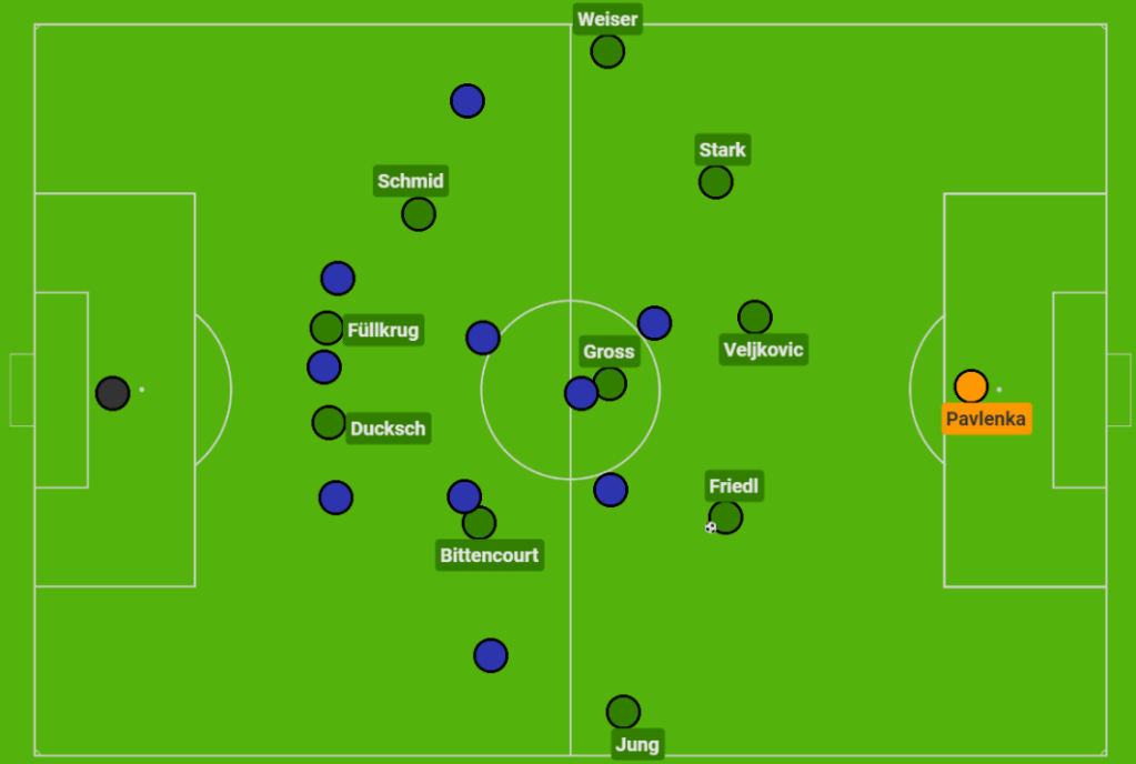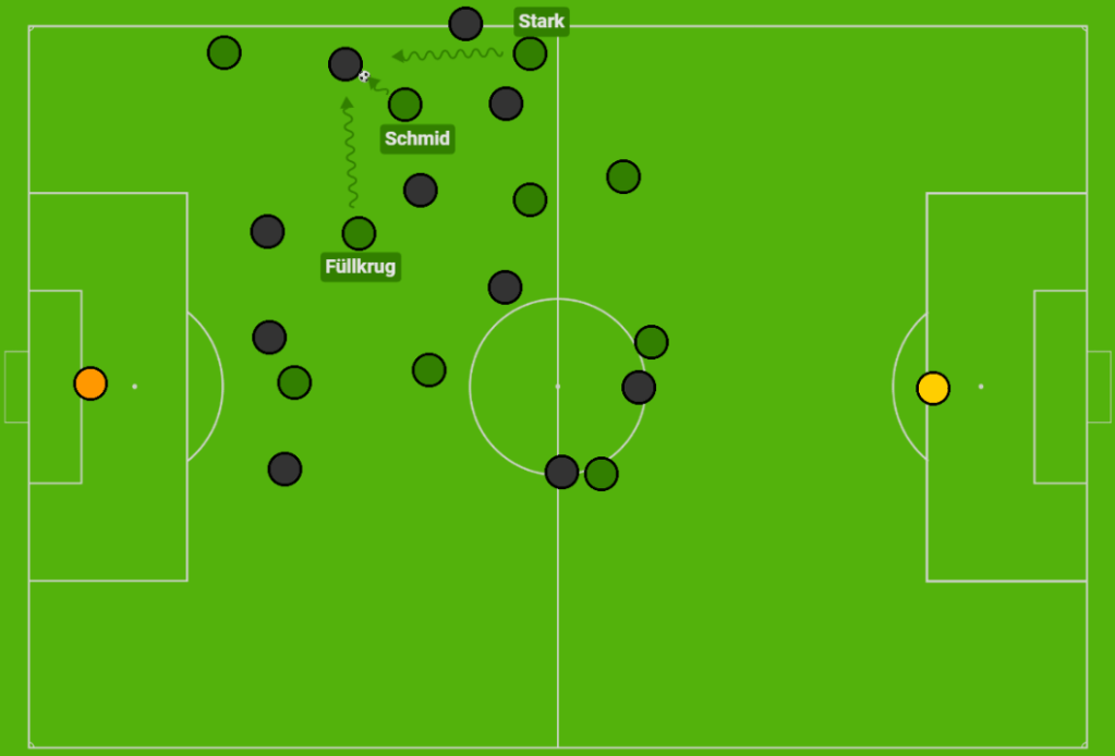 Either Gruev or Gross play as the central pivot, with fluidity often achieved in a staggered shape between the triad. Typically, the most creative midfielder in the team (either Romano Schmid or Leonardo Bittencourt) will operate close to the strikers, allowing for close proximity of combinations if the ball advances into central channels. This can then allow for greater flexibility between the other two as they dismark themselves from the opposition by varying their runs toward the ball.