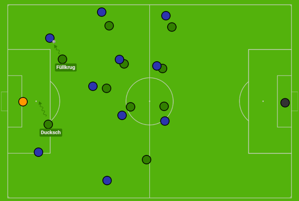 Captain Leonardo Bittencourt has also appeared frequently when not injured, usually in more of an advanced role to support the centre-forwards. It’s those two centre-forwards that have been the standout stars for Werner’s team – Marvin Ducksch and Niclas Füllkrug. They’ve accumulated 13 goals and 5 assists this season between the pair of them, with Füllkrug playing a more impactful role linking the rest of the team to the forward line, as his partner becomes a nuisance in and around the opposition’s defense and drifts wide to deliver crosses. Both will be imperative to any success Werner’s side achieve this year, and Füllkrug’s even on track to compete for the Golden Boot.