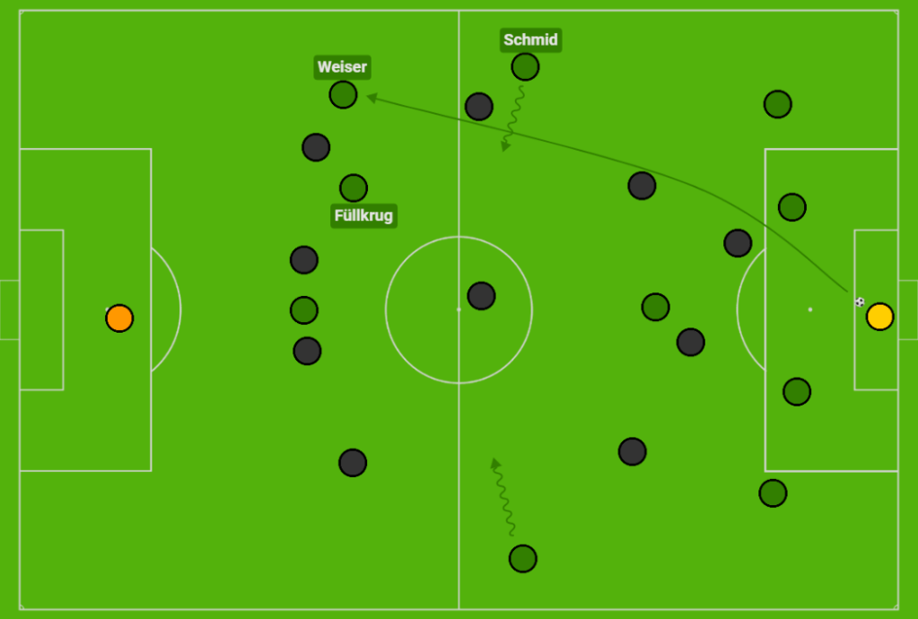 Mitchell Weiser is quick to gallop forward in these attacking moves, always maintaining enough width to stretch the opposition defense. But if the wing-back wants to drift inside and combine with the front two, Romano Schmid can also drift wide to rotate and pull opposition players apart. This is where the ability of players like Bittencourt/Schmid and Weiser to drift toward the strikers again becomes key. With more numbers around the ball, Werder become far more likely to win those second balls, and maintain possession.
