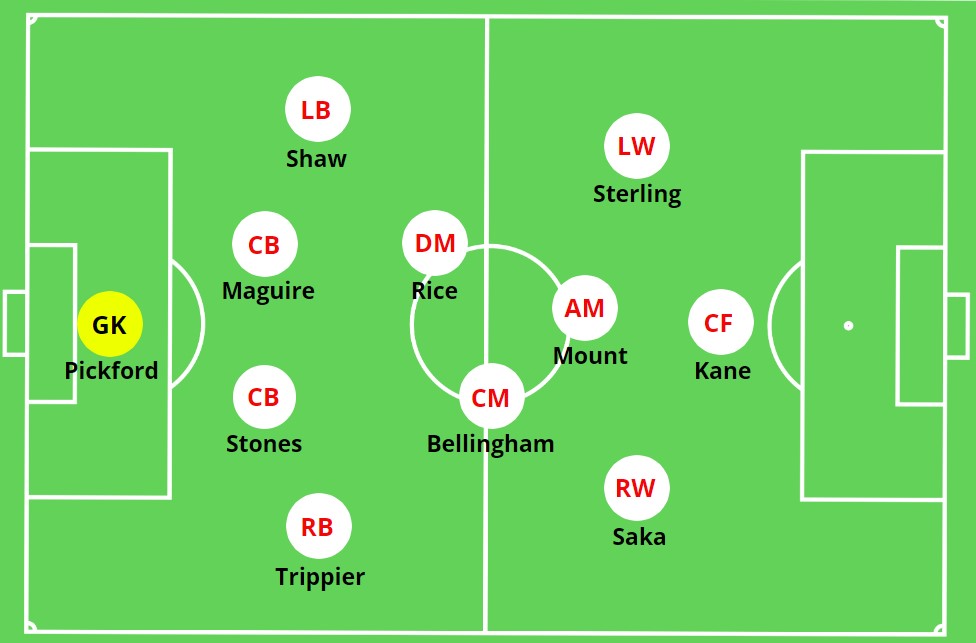The front three has been more versatile and up for debate, especially now given the positive performances of Marcus Rashford and Phil Foden in place of Raheem Sterling and Bukayo Saka against Wales. Harry Kane is perhaps the only undeniable starter in the front line as a leader and captain of the team, and a creative element in supporting the electricity of the others. With a true number ’10’ in the team, Kane’s role is more restricted to staying up top than in previous tournaments. However, he remains an excellent playmaker as he drifts to the wide areas, and others run in behind.