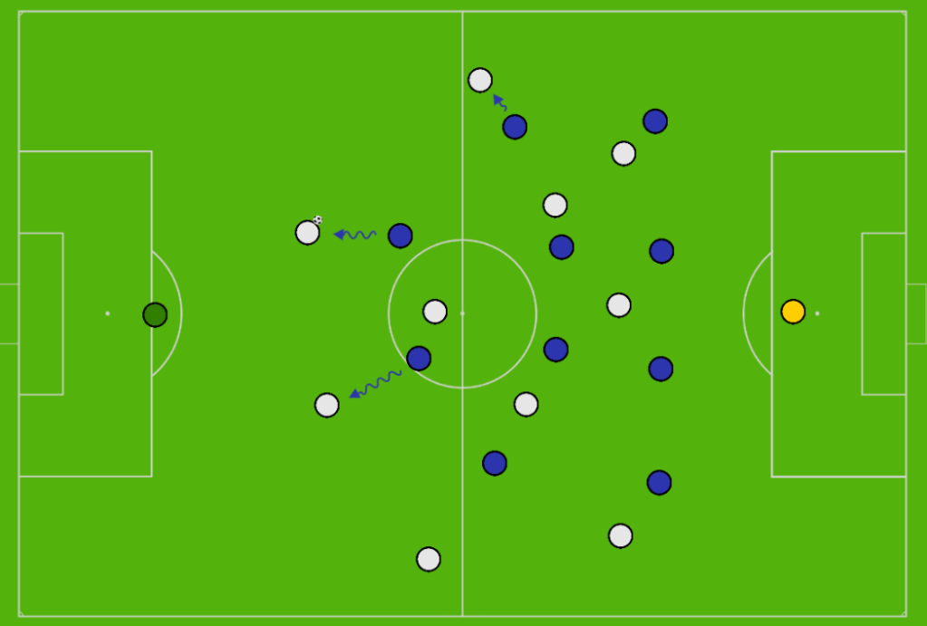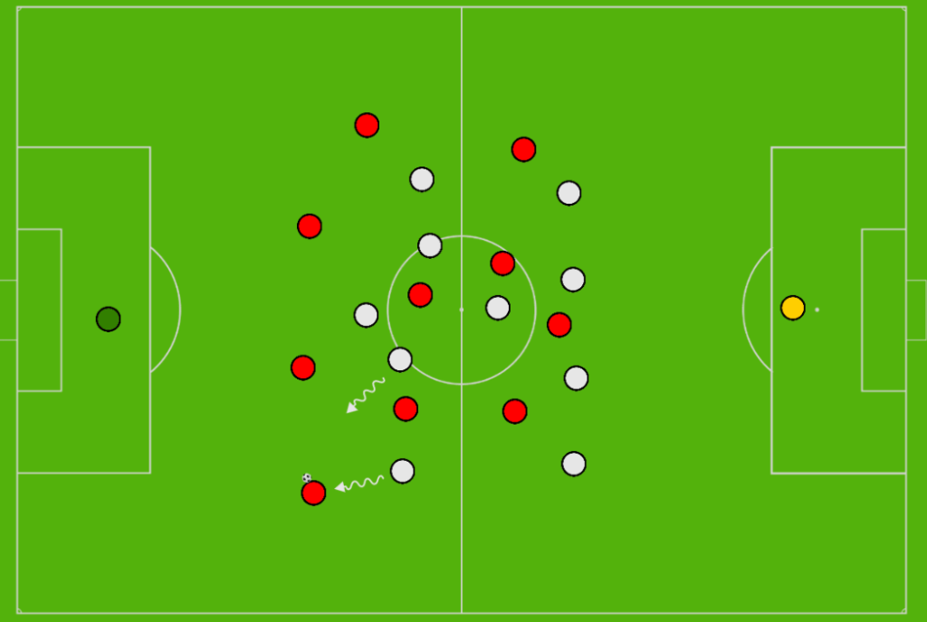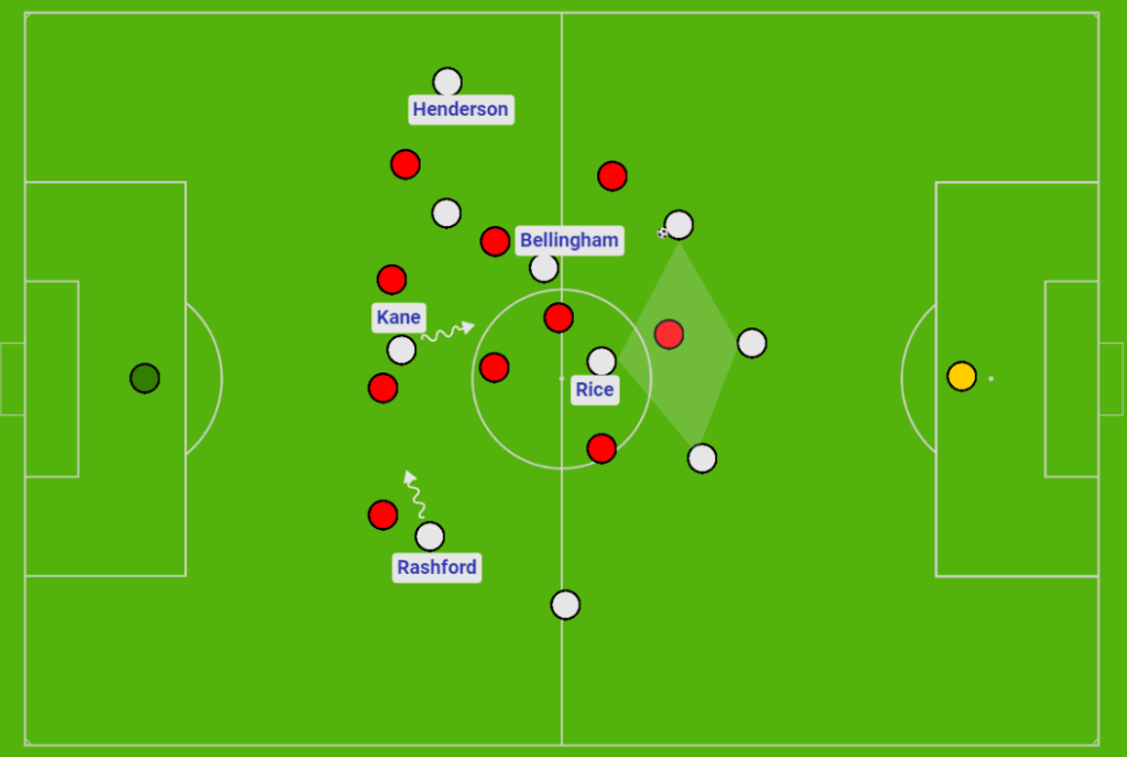 At times you can see the Dortmund star attempting to lead the press from the front or even just by squeezing the opposition wide. Using the sidelines as an extra defender, Bellingham is quick to move across and suffocate the dribbler before he enters the final third. However this could be far more effective with the added support of Kane and another midfielder, even if the opposite winger was to maintain width for a switch of play.
