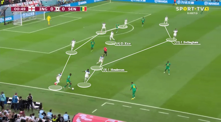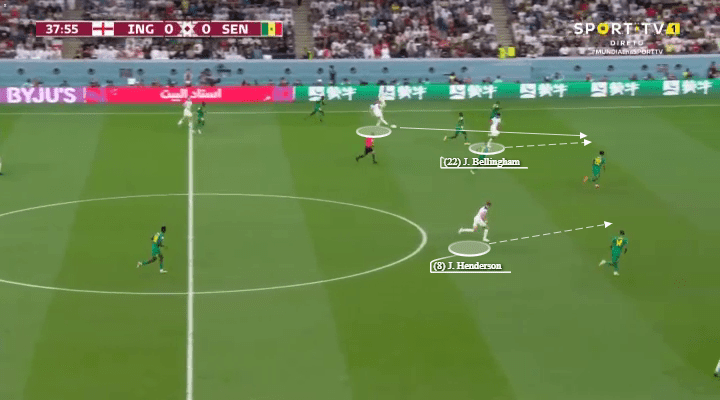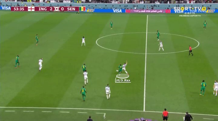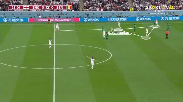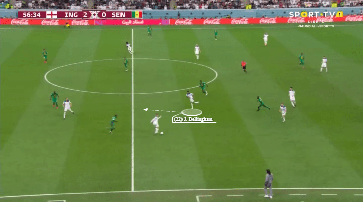The 4-1-4-1 shape can often be seen in the low-block in particular, to which Bellingham remains a critical component to breaking up possession. He’s a defensive warrior who wants to win the ball, and the benefit of having him win the ball above others, is that he has the explosiveness, fanciful footwork, drive and bravado to take five players on all by himself – and succeed in doing so. This is where the Dortmund man excelled against Senegal on his brilliant assist to the assist for Harry Kane’s goal, pouncing on a mistake from the Senegalese, and then exploding.