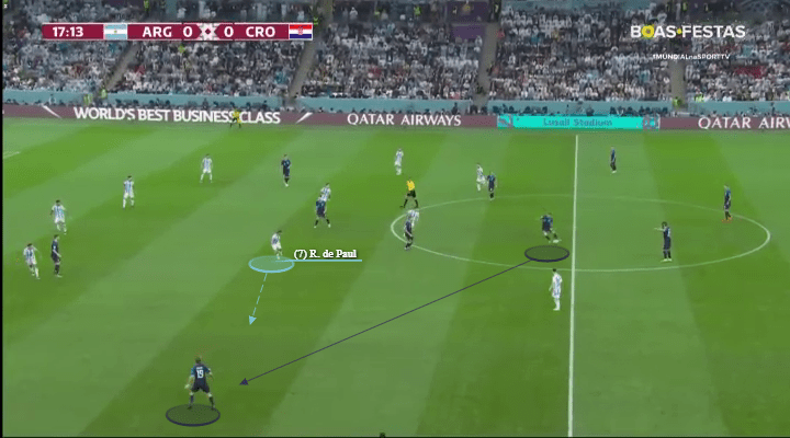 In helping those eccentric defenders remain composed, Argentina typically defend in the shape they start the match in, such as through a 4-4-2 or 4-3-3. In either shape, you can expect the midfield to become incredibly narrow and compact, and a relatively rigid man to man approach against players who need extra attention. De Paul for example matched up for size against Mateo Kovacic in the semi-final, forcing the Chelsea man into probably his least impressive display of the tournament. Perhaps even more impressively, the Atletico man held double responsibilities on the day, as he was still required to shift wide the moment the ball travelled into the path of Croatia’s left-back, Borna Sosa.