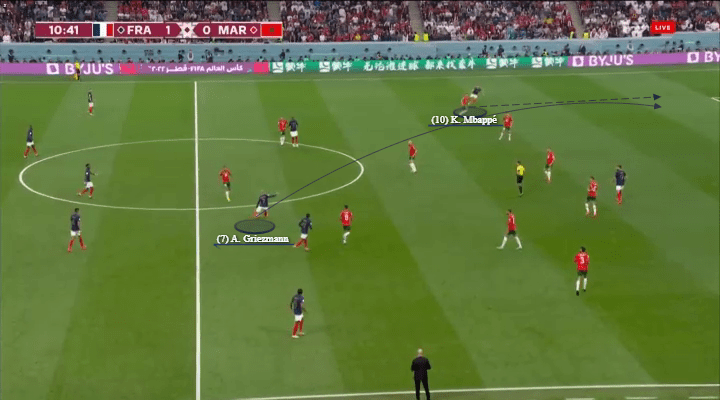 Moreover, Griezmann is exceptional at understanding how and when to come toward the ball. Against sides like Morocco that are incredibly organized defensively, Griezmann has no problem coming in-field to pick up possession. He then scans for the right moments to play line breaking passes over the top, such as magnificent long passes into the likes of Mbappé and Giroud.