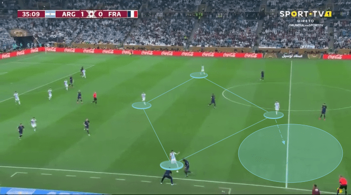 The initial starting blocks of their high-block swapped in between a 4-2-3-1 and 4-2-4, which allowed the likes of De Paul, Mac Allister and Messi to get on the ball in the half-spaces and pull French players out of position. The French were perhaps too rigid in going man to man, which is never a good idea against players with the skill level of Messi and Di Maria. The variety of Argentina’s 2-1-4-3-esque shape out from the back led to many moments of bright and positive possession from Scaloni’s team, and Otamendi had no trouble carrying the ball out from the back against Giroud and co.