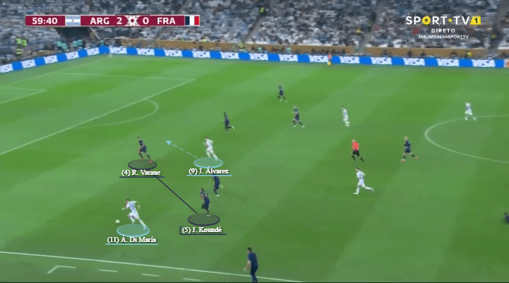 Compounding matters, they were uncharacteristically sloppy in possession, needlessly giving the ball away in dangerous areas. Argentina were excellent with their anticipation and intercepting, but also had the ball handed to them on several occasions. On the break, the first look was always directly into the wide areas, typically on the side of the player who had lost the ball in their attempts to make something of a forward-thinking thrust. This is where Angel di Maria thrived, tearing Jules Koundé to shreds. In fact, Raphaël Varane was constantly put into a position where he had a decision to make – either leave his position and put pressure on the wing wizard, thus vacating Julian Alvarez, or stick with the City striker and wait for Koundé to catch up.