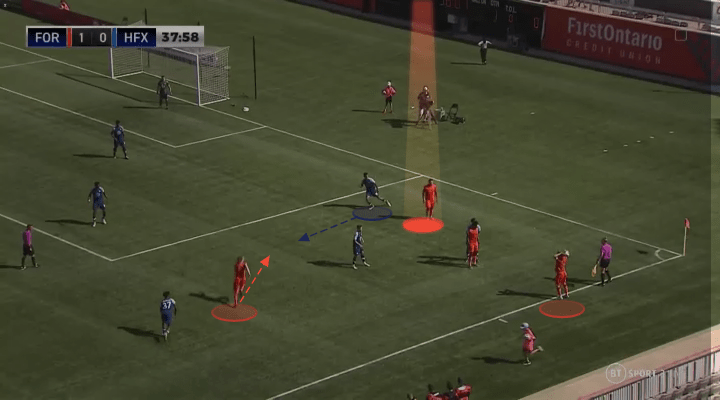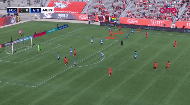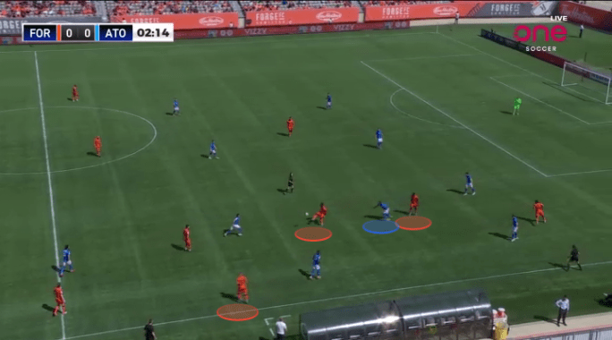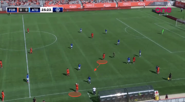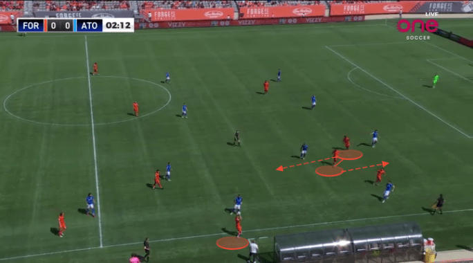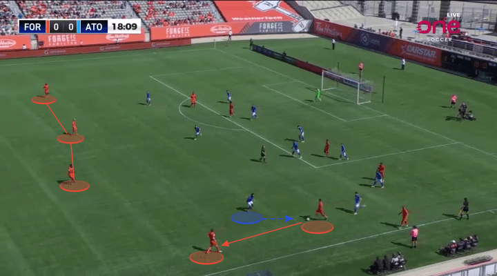 In any successful rotation, one player will move away from the ball, as another moves toward it. The player that moves away from the situation often acts as a trigger for the intended target to receive. Forge are masters of this art, and frequently used Aboubacar Sissoko to shift away from the situation, as Pacius advanced toward the ball. This again allowed Forge to free up one of their best back-to-goal receivers, away from any opposition defenders.