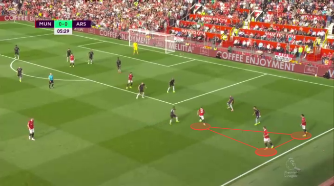 Other times we get more of a 2+2 box quartet dictating the tempo and flow of the match, as Varane, Martinez, Casemiro and Eriksen bounce passes back and forth to one another until the right opening. Instead of Eriksen, the extra member of this build might even be an ‘Inverted Fullback’, as Malacia or Shaw drift in-field to open more space for Rashford to receive down the left wing.