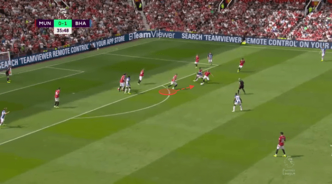 Importantly, Ten Hag has nicely adjusted the high-line utilized under previous managers, now seeing bigger gaps in between the front four and the second two lines in their system. We’ve spoken about teams like Brighton that adopt this kind of pressing approach in the past, and how it naturally incentives the opposition to play less dangerous, shorter passes in connecting through the thirds; while simultaneously setting up nicely to deal with long passes over the top. The introductions of Casemiro and Martinez have simultaneously helped with their speed and aerial presence in dealing with those longer passes. Both are adept at using their body to win aerial duels, and positionally savvy enough to know how and where to cover space.