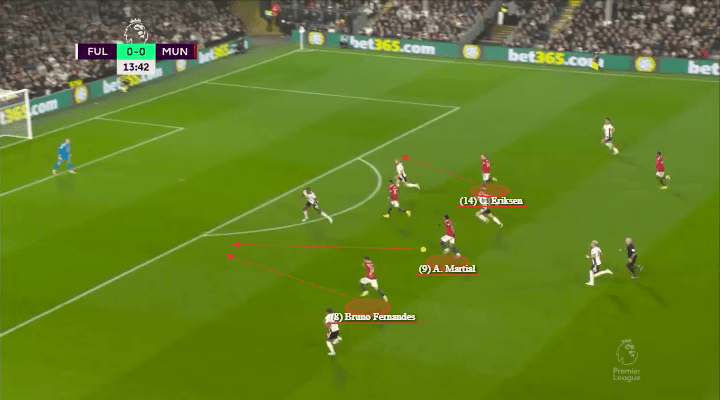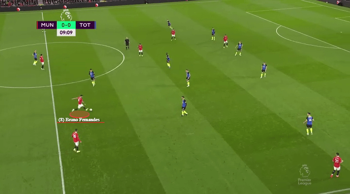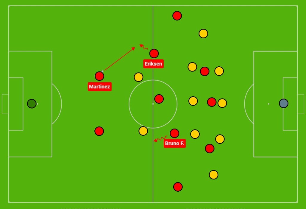 But now he can instead hang higher and selectively pick those moments to drift deeper, as Eriksen plays that deeper-lying role. This then means Bruno is more likely to be in the right areas of the pitch when the team quickly advance into the final third, and can pull the strings closer to goal.