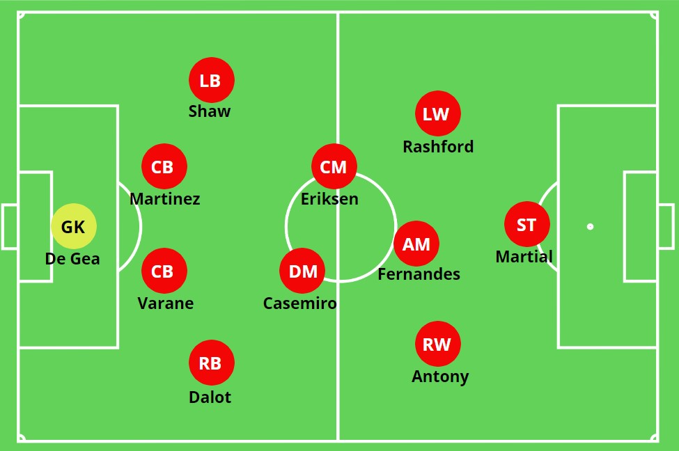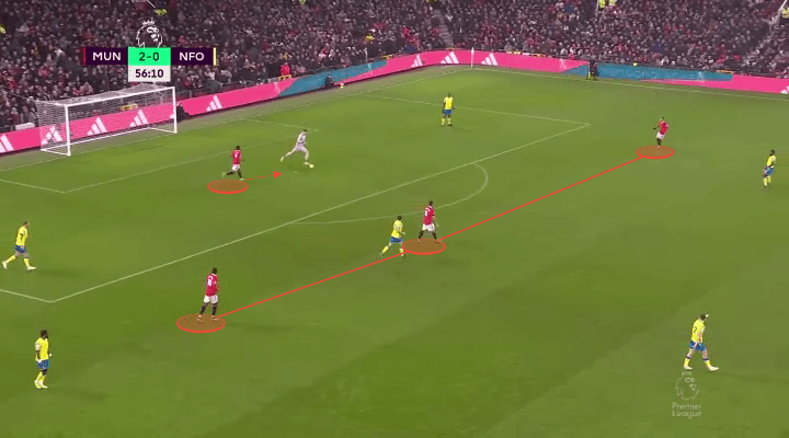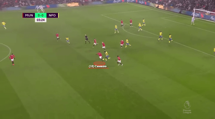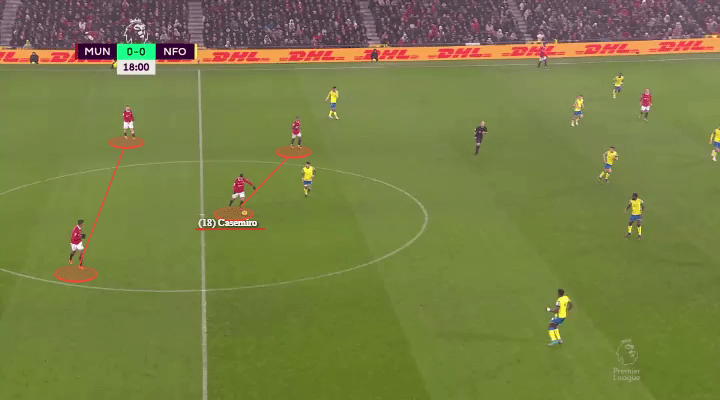 The duo have also helped to drastically improve the team in transition for the exact same reasons. Martinez will often give himself a bit of a gap away from the nearest player to ensure he wins the foot race, while Casemiro will nicely cover for out of position fullbacks and shift wide at the right moments. Combine that with the experience and tactical acumen of Eriksen and Varane, and you suddenly have a Premier League title challenging quartet along the central spine of the team.