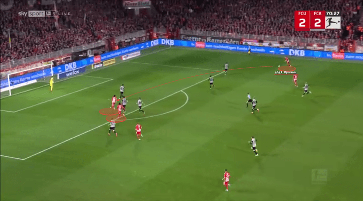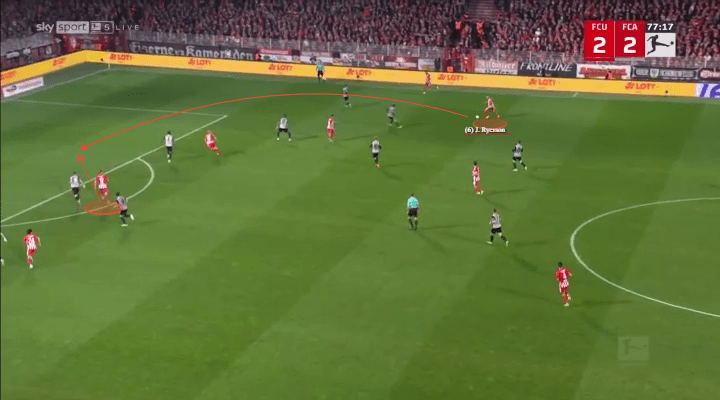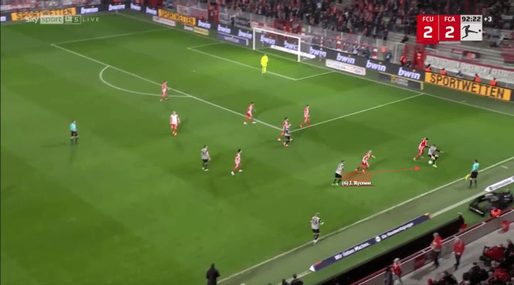 Embed from Getty ImagesAs a member of Union Berlin, Ryerson must also be more than capable of defending. Luckily for Urs Fischer, Ryerson has an aggressive edge matched with supreme timing. Union will often compact the wider areas in numbers, aiding in Ryerson’s ability to win the day.