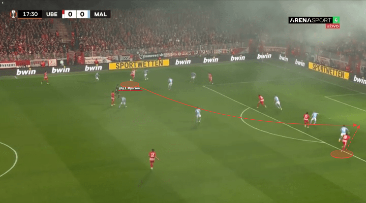His speed is not only positive in Union’s quick attacking transitions, but also in ensuring he can quickly gallivant back in defense. This is the key area in which Raphael Guerreiro and Thomas Meunier lack, and where Dortmund can often be punished out wide. Ryerson on the other hand is quick to sense out the danger, and effectively cover the gaps.