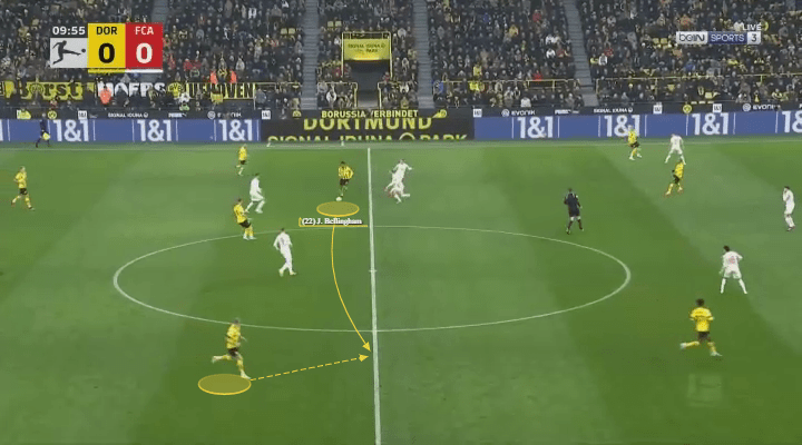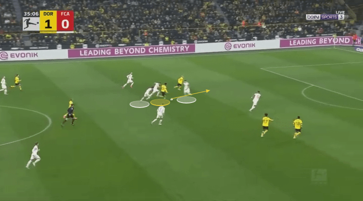 This means that he’ll often drop in deep to pick up possession, making Dortmund’s 2+1 circulation in the creation stage into more of a 2+2. He’ll then shift and shimmy the shoulders to spin away from the nearest defender, before breaking several lines at once.