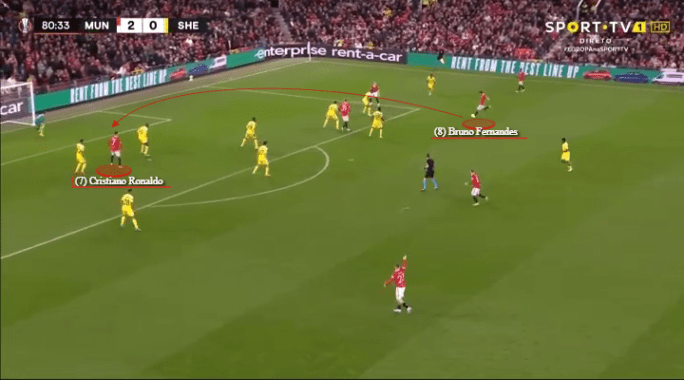 Just over ten minutes later, Diogo Dalot picks up the ball with acres of space to drive at the opposition in transition. Bruno is again out wide with acres of space himself to receive with an open body shape – away from the congestion.