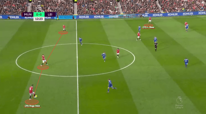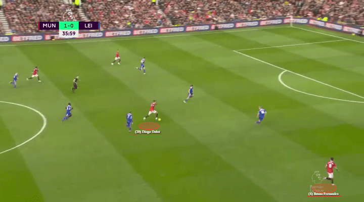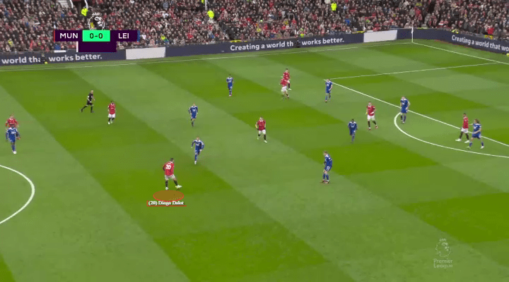 So you must be screaming that the right answer is to heavy metal pressure the situation, and reduce the time that Bruno Fernandes has to see his options. But look who’s there if the Leicester man leaves his current position. Diogo Dalot will now receive in space of his own. Not only that, he’ll receive in a position closer to the opposition’s goal, with a higher likelihood of being to carve the opposition open from that dangerous half-space channel.