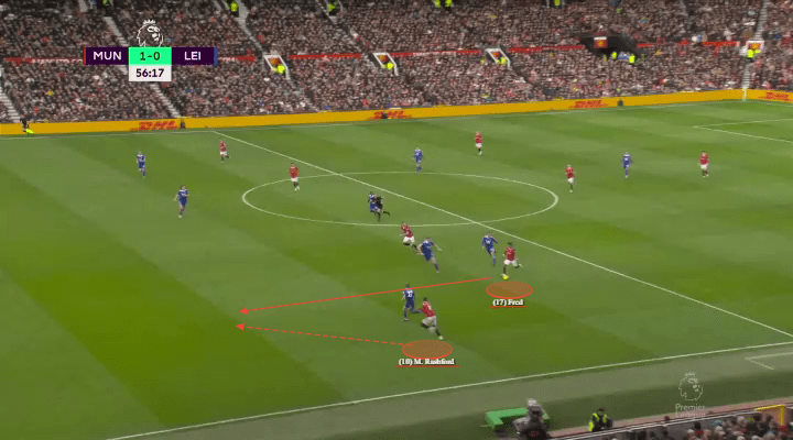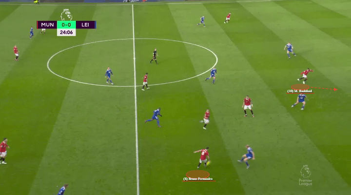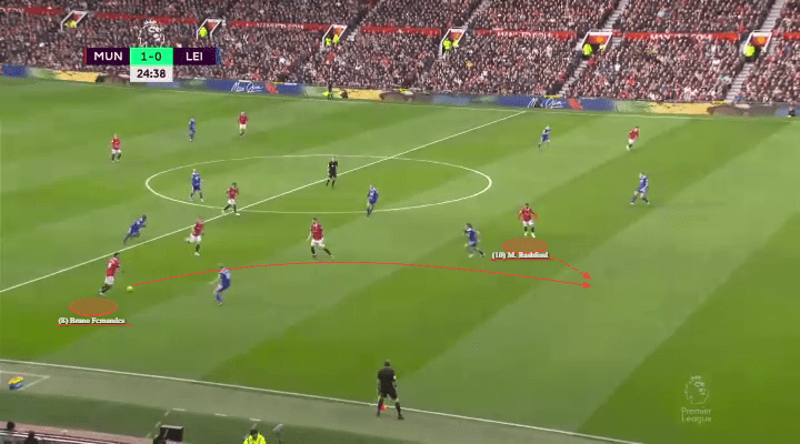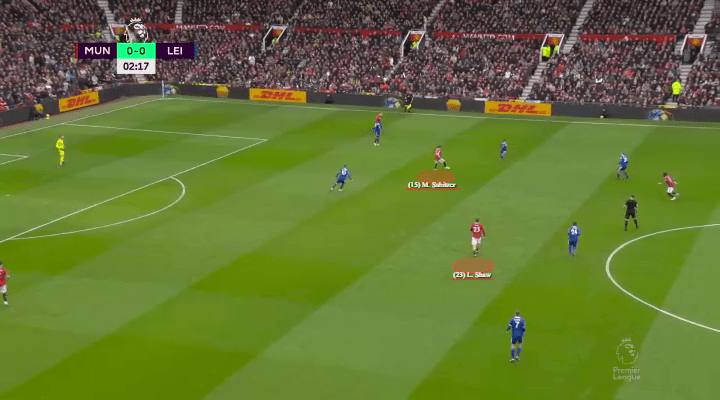 Leicester must either react by having their closest player pressure the ball, or they allow the potential for a dangerous pass to be played. If we know anything about Marcus Rashford this season, it’s that he’s thrived off dangerous passes over the top – where he can allow his undeniable speed and precision to take center stage.