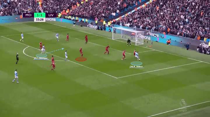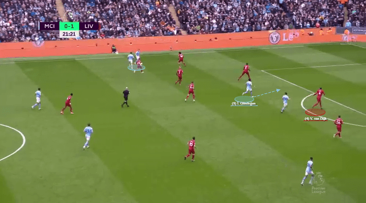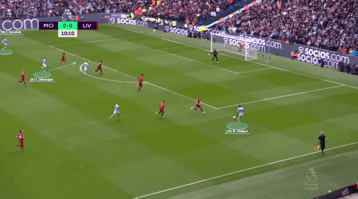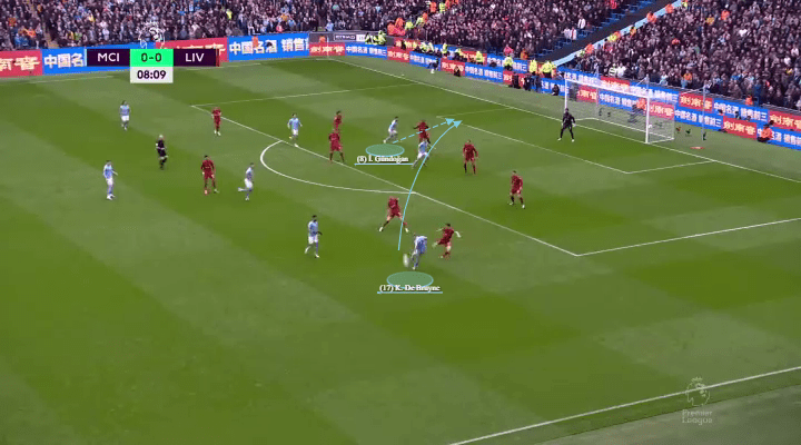 Gündoğan is known for making late runs into the box to finish off chances. But he’s also adept about knowing when to float up toward the team’s striker and create a second option for a cross. Here he is popping up at the back-post to cause greater havoc for Liverpool’s centre-backs, creating one of City’s first warning signs.