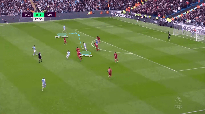 From that left-half-space, he could often create room for himself to the left of Fabinho, and then look for gaps between Konaté and Trent Alexander-Arnold. In doing so, he constantly pushed Alexander-Arnold inside, lessening the attention on his team’s left-winger – Jack Grealish.