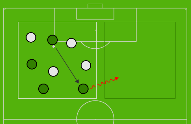 - Possession-based games without purpose: Instead of restricting players to a certain number of passes or touches before they can score, reward players when they do that certain number of touches or passes and then score. For example, three passes and then a goal = 2 points.