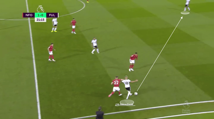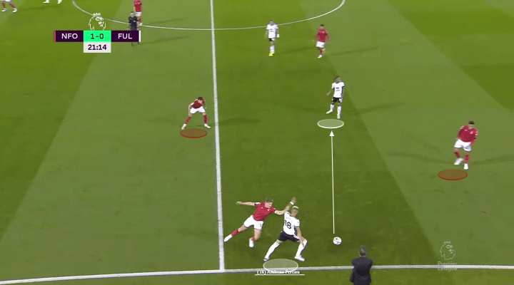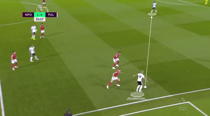 In other moments, you may actually need to be patient due to the lack of options. There’s a fun clip of Andreas Pereira dancing around a Nottingham Forest player, before playing a safe and simple pass. You may not notice all of the scans here, but Pereira assesses his options several times in the move, and waits until he’s created exactly the right amount of space to play in the pass.