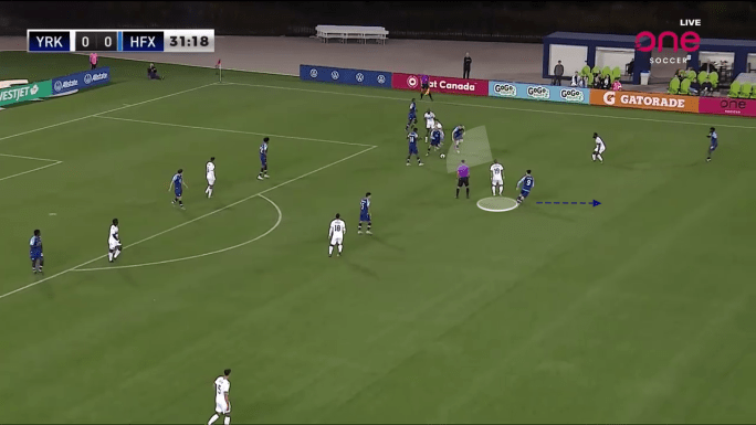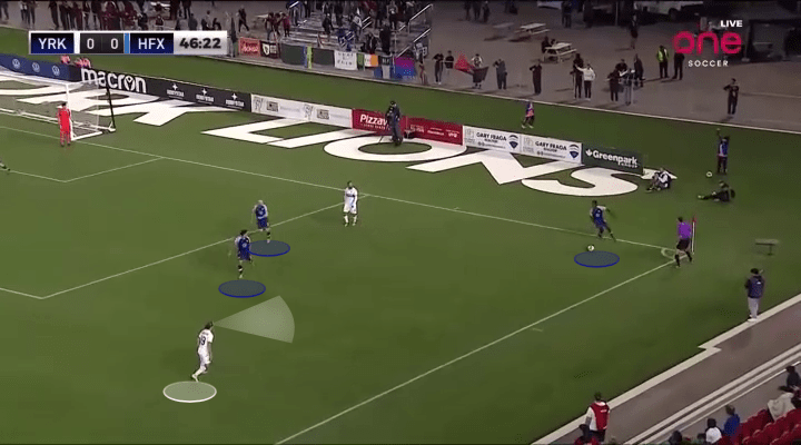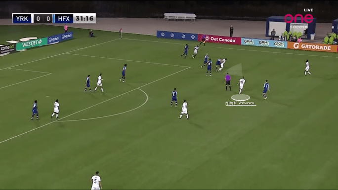 Verhoeven sees the ball, and within his periphery, he can see two potential passing options. All he needs to do is hold his position. It would stop the man on the ball from playing one over the top down the line, and it would allow the York man to quickly come across if one of the other two players receives instead.
