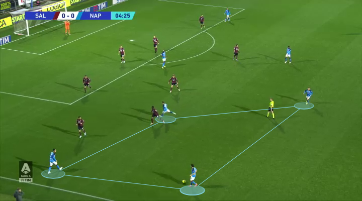 From getting himself into a stellar position right from the start, he then reduces the constant need to scan for the space ahead. He can then focus more of his attention toward the opposition (ensuring he stays onside), the ball (ensuring he times his run to stay onside and receive the pass), and the actions of his teammate (responding to an outside of the boot pass to know the direction it’s likely going to spin).