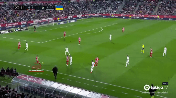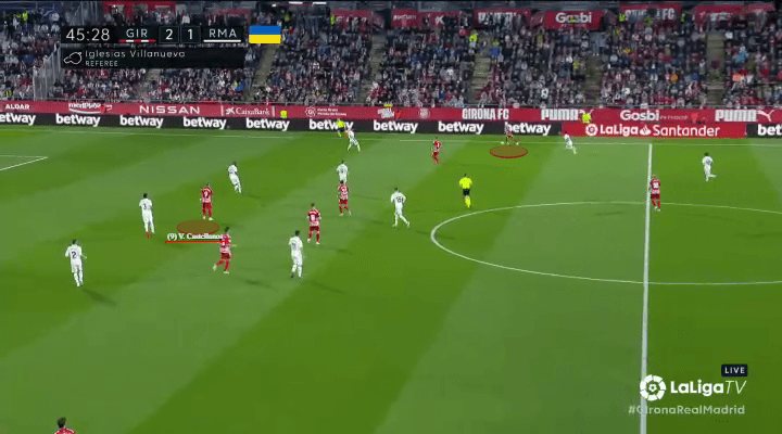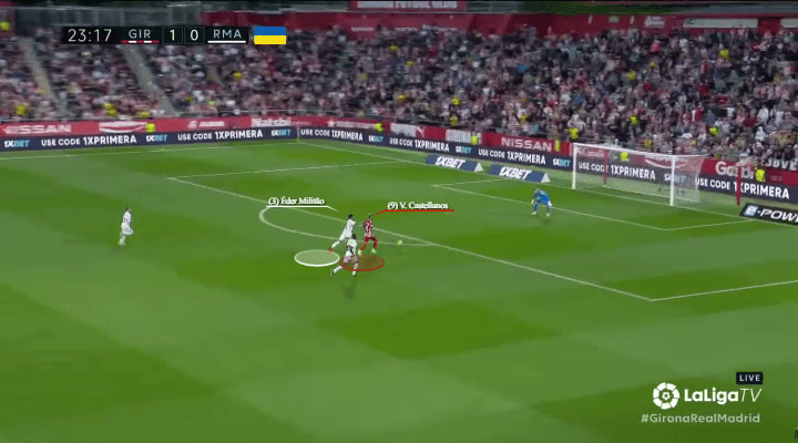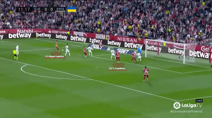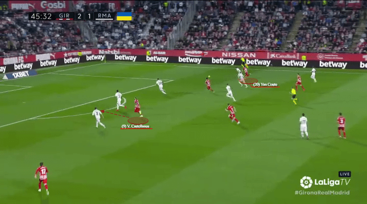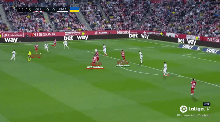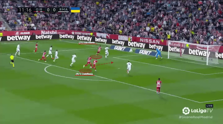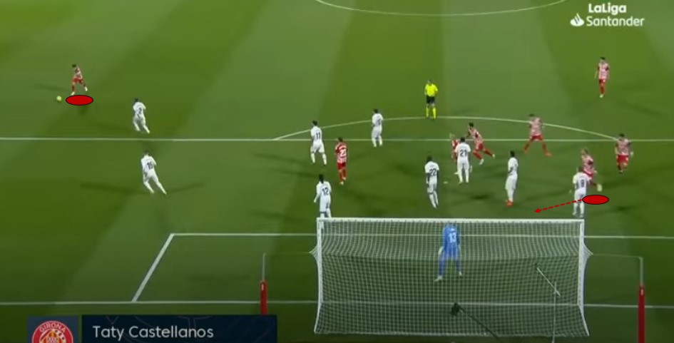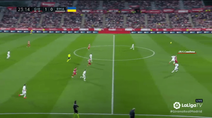 When Girona first escape their wide overload, Castellanos begins to peel away from the nearest marker (Toni Kroos), while keeping distance from Madrid’s defensive line and the brute strength of Antonio Rüdiger.